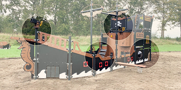 Each pirate ship is divided into four smaller zones. This allows several groups of children to play simultaneously without disturbing each other. The zones have different play activities that all …