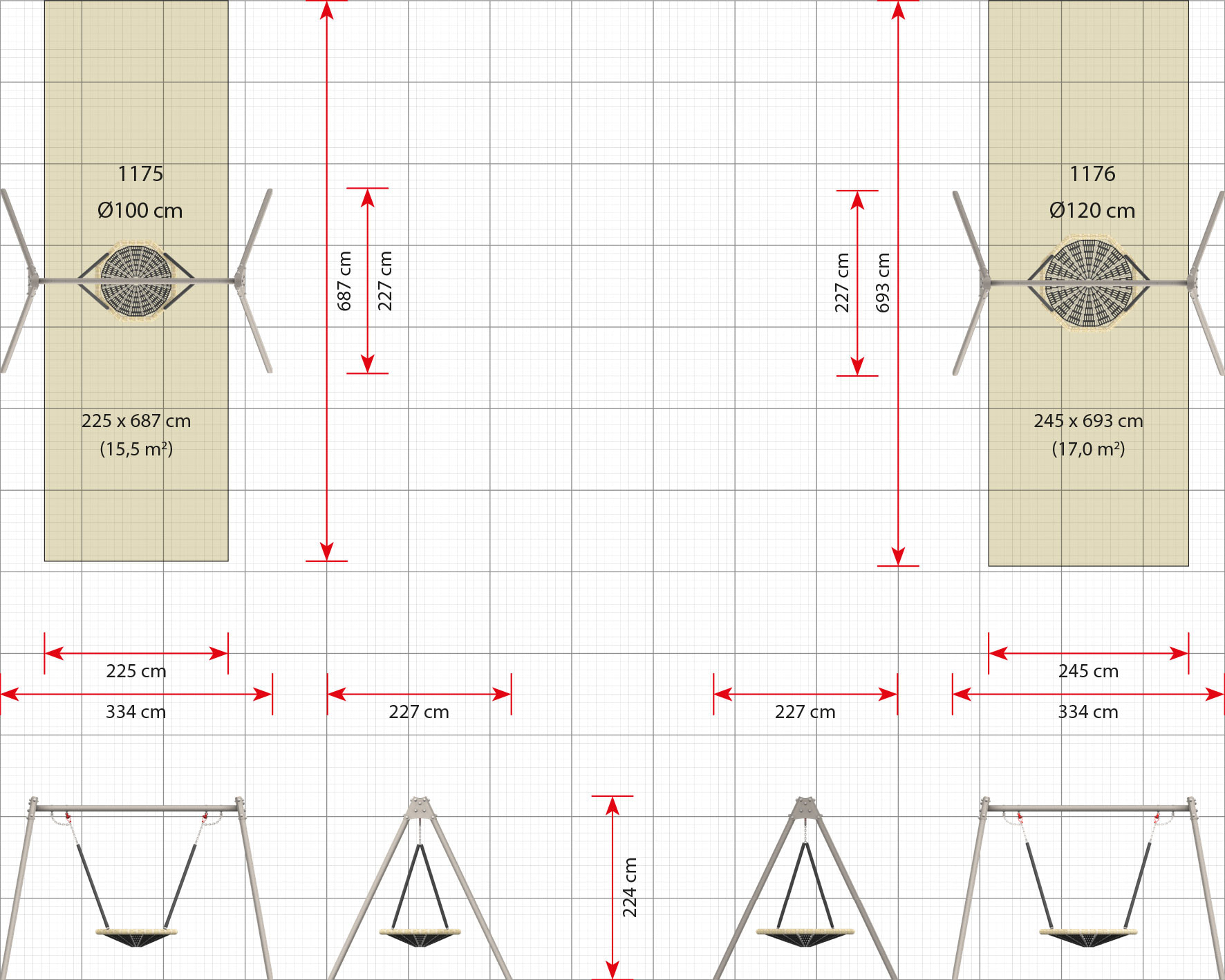 Area requirement incl. safety distances (LxW)334 x 687 cm