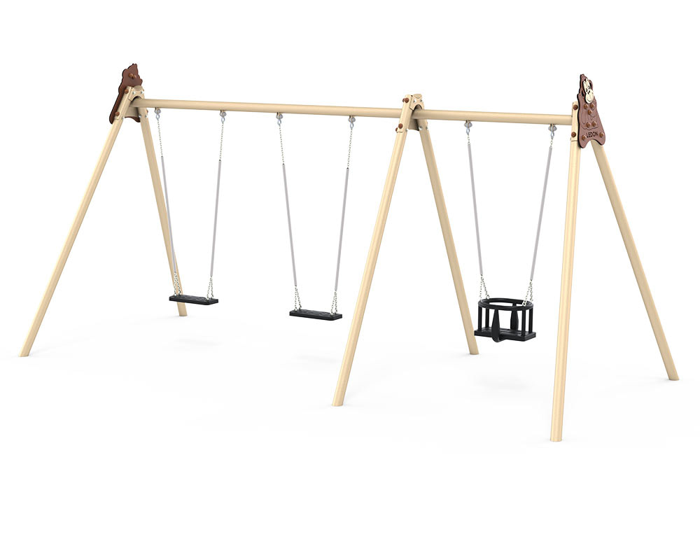 A modular swing frame makes it possible for several children to swing at the same time. In addition, the modular swing frame is available in several different combinations, which can be tailored to specific age groups or span a wide age group depending on which seats are chosen.