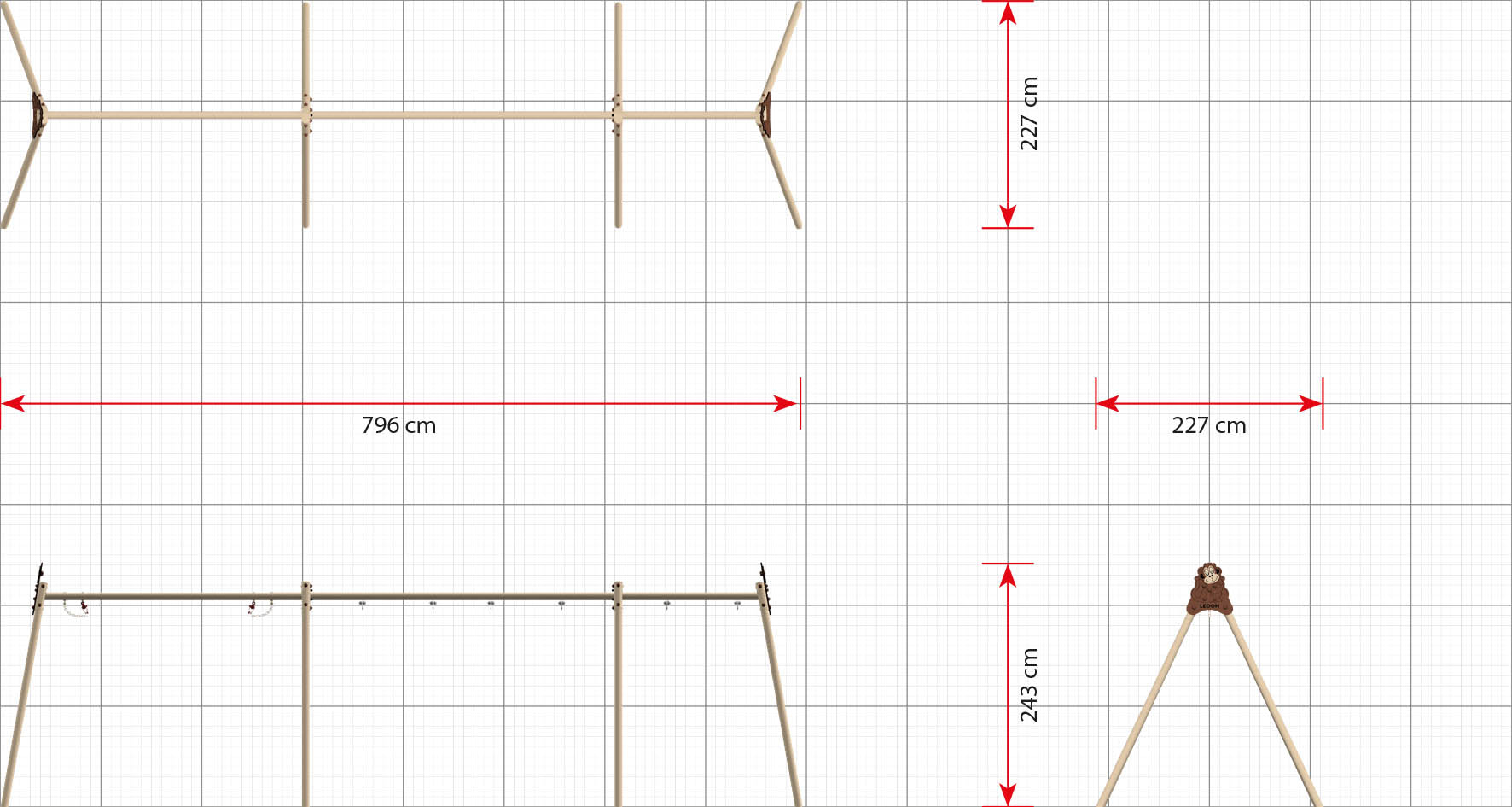A modular swing frame makes it possible for several children to swing at the same time. In addition, the modular swing frame is available in several different combinations, which can be tailored to specific age groups or span a wide age group depending on which seats are chosen.