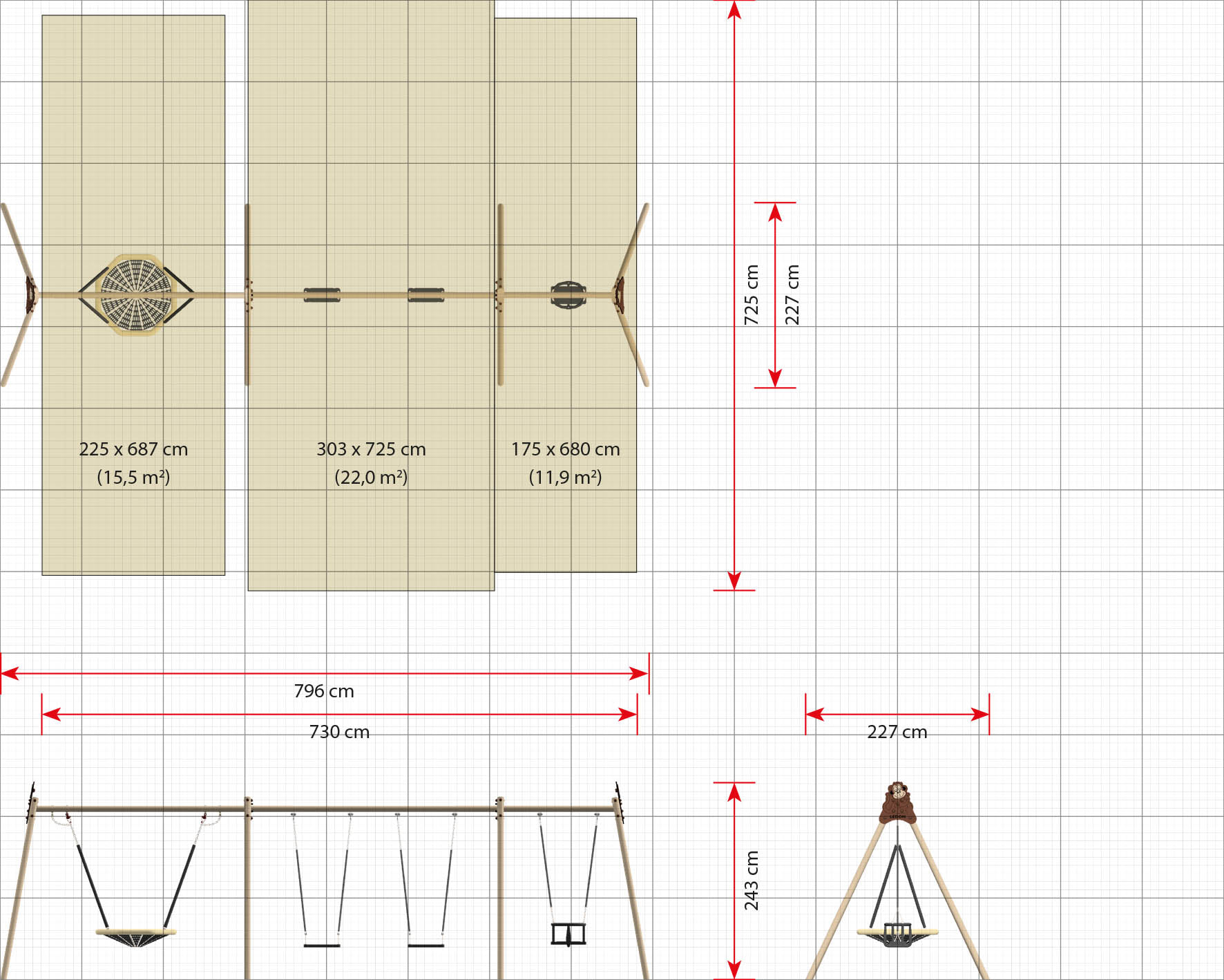 A modular swing frame makes it possible for several children to swing at the same time. In addition, the modular swing frame is available in several different combinations, which can be tailored to specific age groups or span a wide age group depending on which seats are chosen.