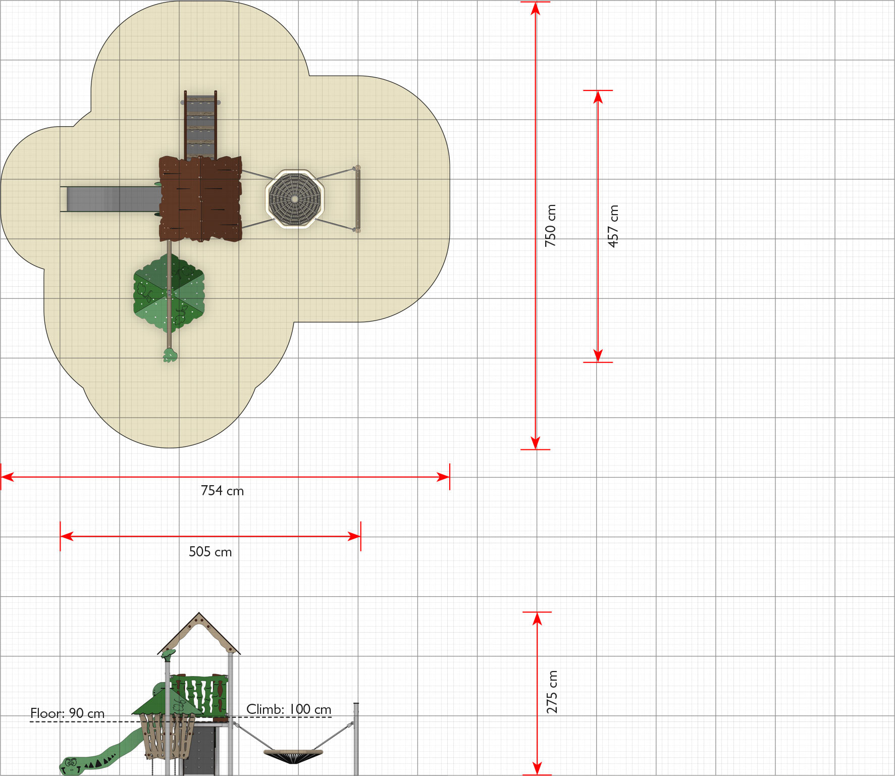 Area requirement incl. safety distances (LxW)754 x 750 cm
