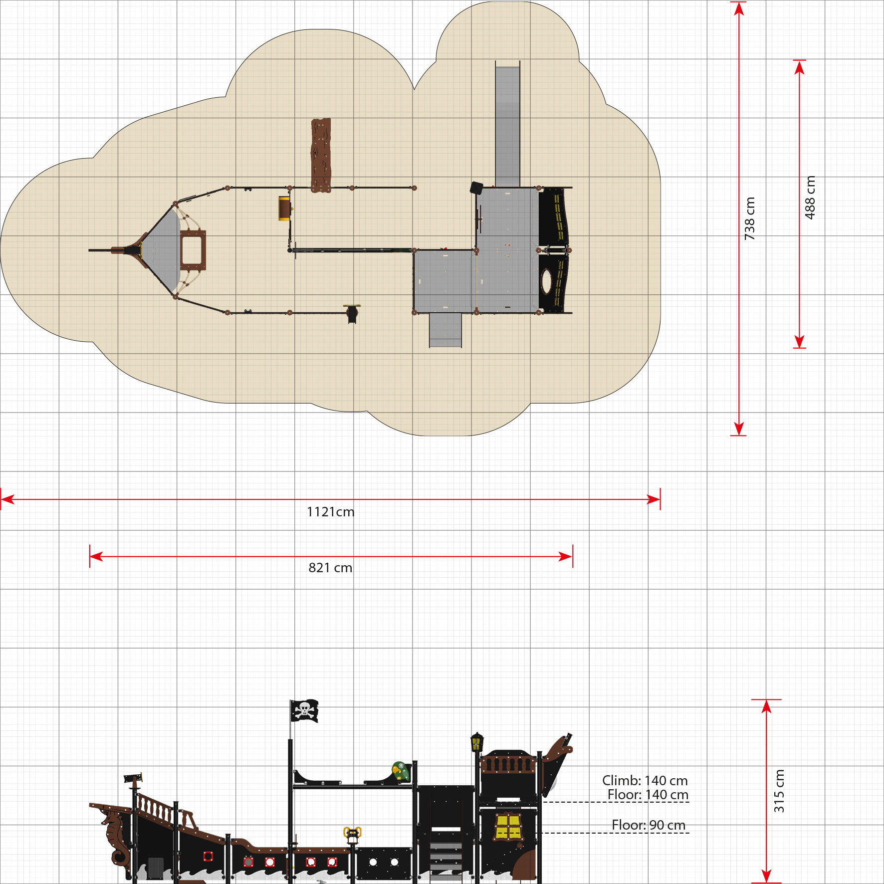 Hafnia is one of our large ships which we have made more inclusive. The ships of this size are real pirate universes, with too many activities to list them all here. Apart from the many movable parts, which can also be found on the smaller pirate ships: ship’s wheel, compass, anchor, rubber hatches, telescope etc., on the large pirate ships, children can also play in the captain’s cabin, where there is a treasure map, dungeon, diamonds, rubber hatches, the moving crab and many other play activities.